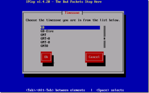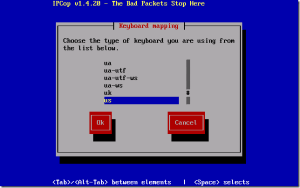Select your keyboard layout using the TAB key, and again, TAB down to OK.
