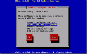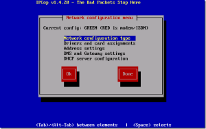 You can also configure IPCOP to be a DHCP server,but we do not need to do that for this setup. You will be prompted to do this after selecting DONE on the network configuration menu.