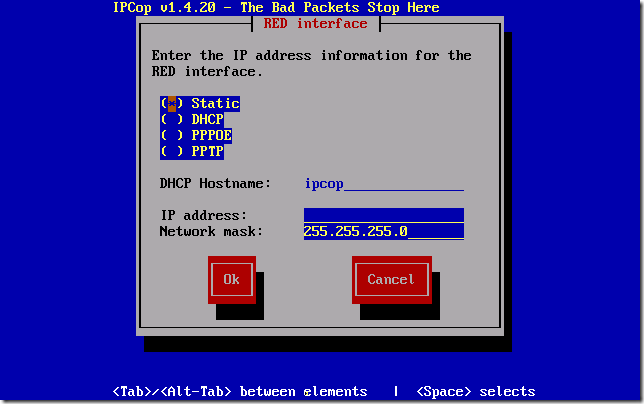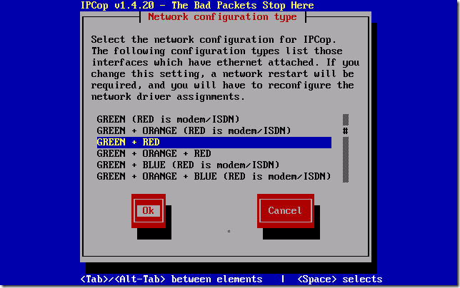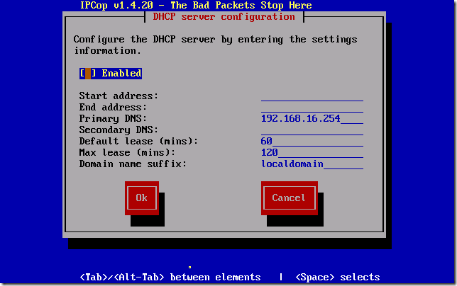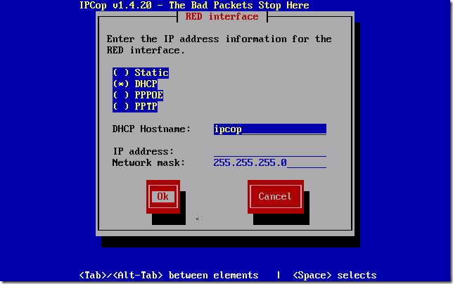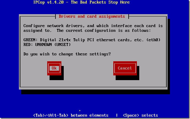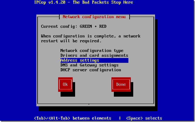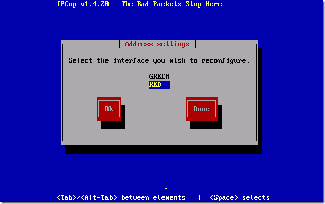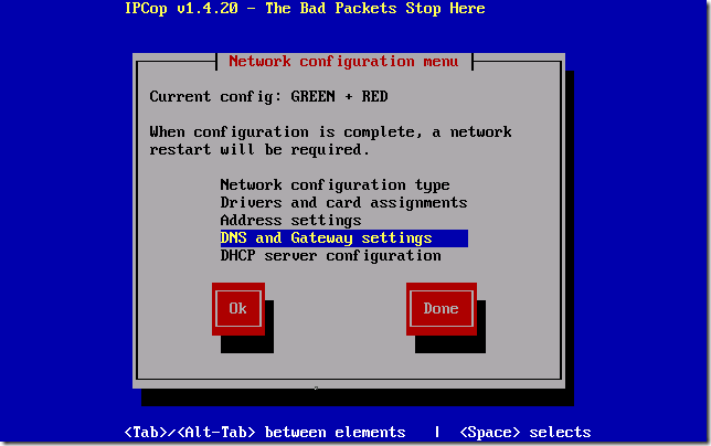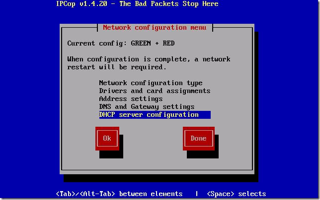 You can also configure IPCOP to be a DHCP server,but we do not need to do that for this setup. You will be prompted to do this after selecting DONE on the network configuration menu.