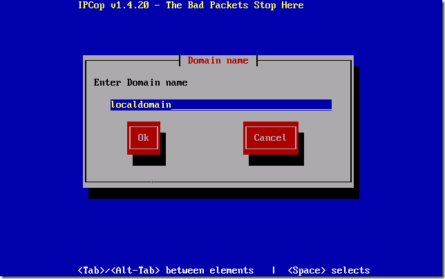 Choose an internal domain name, and TAB down to OK. I am leaving mine on the defaults. IPCOP.localdomain