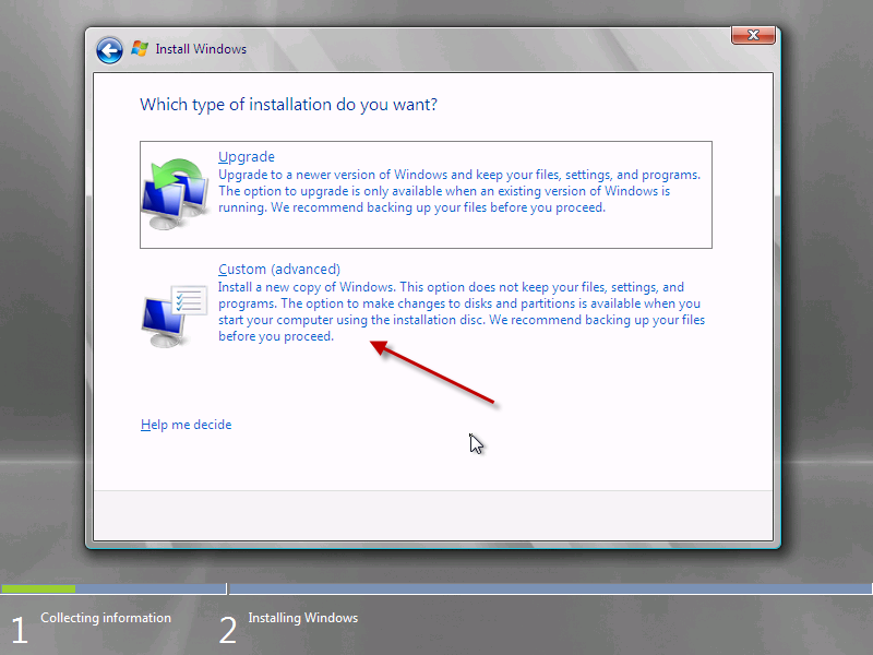 We only have one option now which is to install. You may want to review the ‘what to know before installing windows’ section, now is your chance.