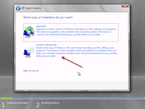 You will need to select whether you want an Upgrade or Custom Install. I haven’t actually tested to see what happens if you click Upgrade – suffice to say an upgrade is not a supported migration path from any version of Windows. I am doing a new clean install, so i am selecting Custom.