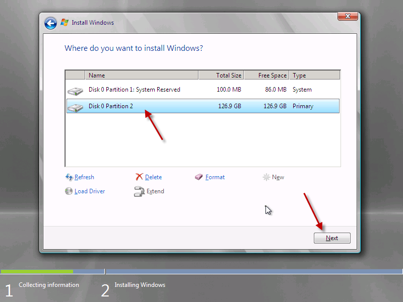 Select the partition you wish you wish to install onto, in my case Disk 0 Partition 2, and click on to Next.