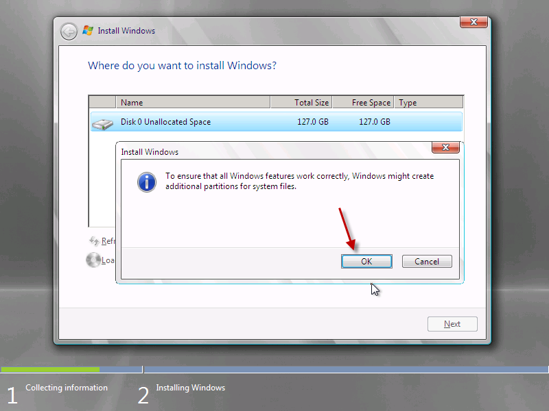 Setup will flag up a warning about partitioning the drive, so that all windows features work correctly. This will also partition a small area of disk (about 100mb) that is reserved for use with BitLocker, it also hosts the Boot loader and Windows PE files.