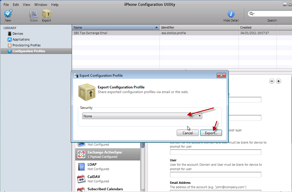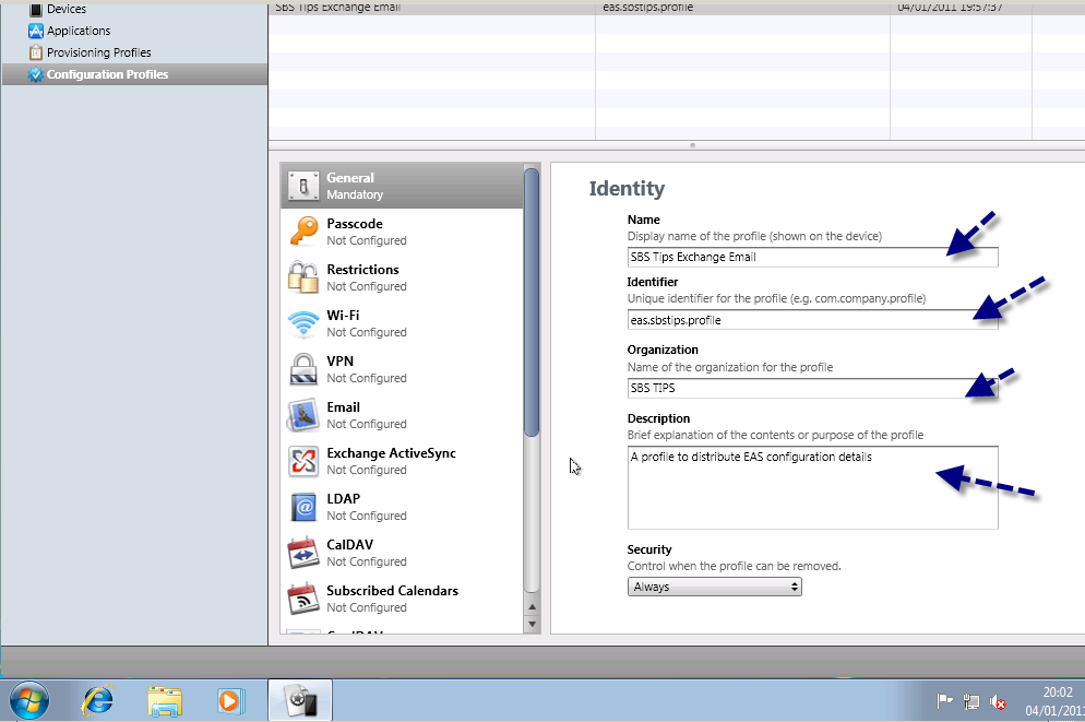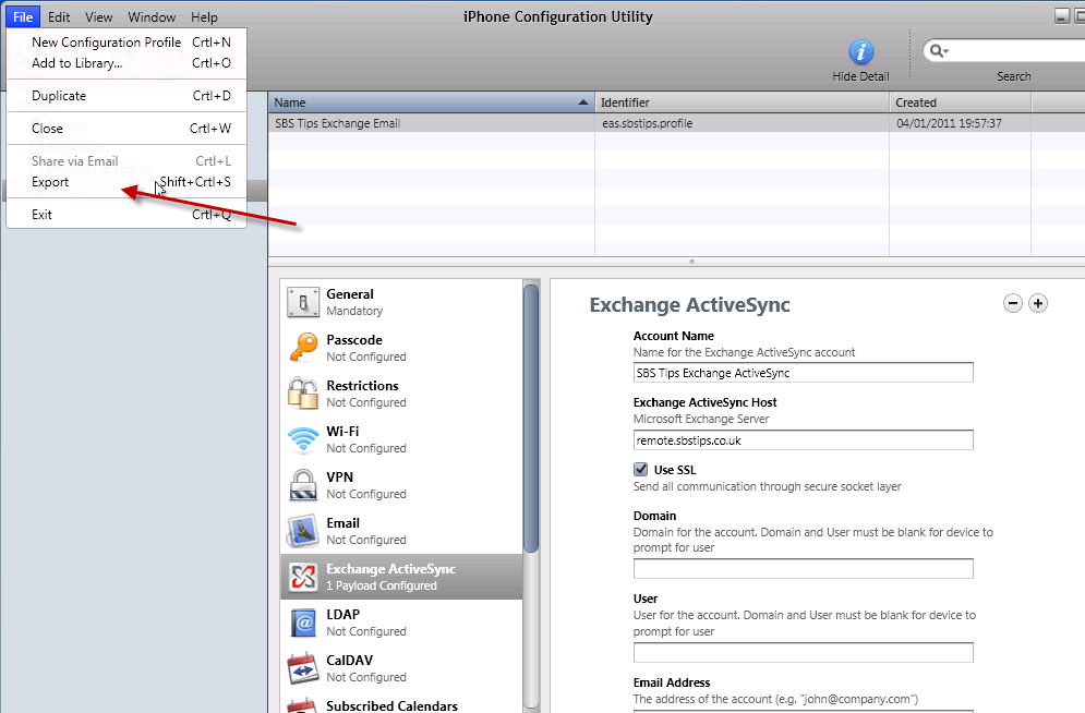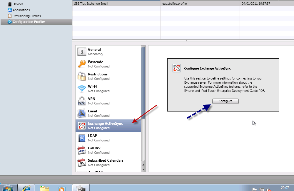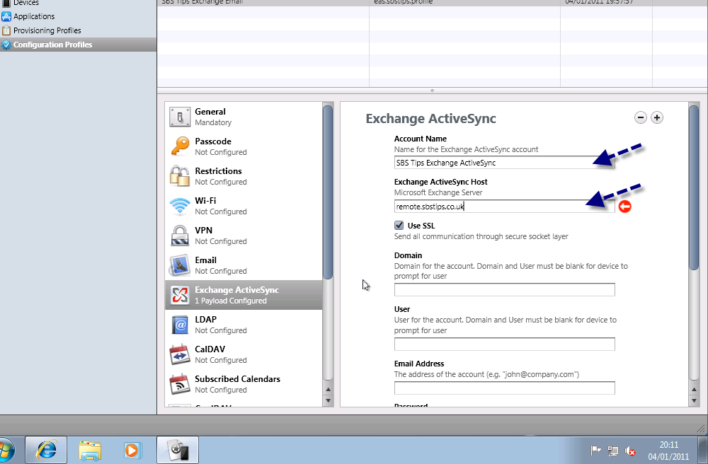 In order to follow this procedure through, you will need to download the iPhone configuration utility here, you will almost certainly want access to an iPhone (Mine is an iPhone 4) you will need access to an SBS server (2003 or newer) with Exchange ActiveSync published to the internet. You will also need a web server to host a file on, preferably in a folder you can password secure.