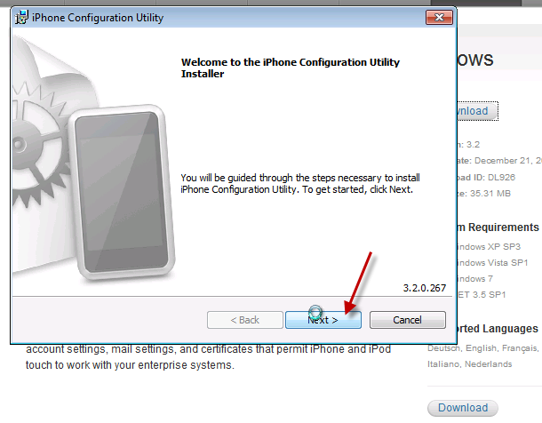 On the welcome to iPhone configuration utility installer page, click Next.