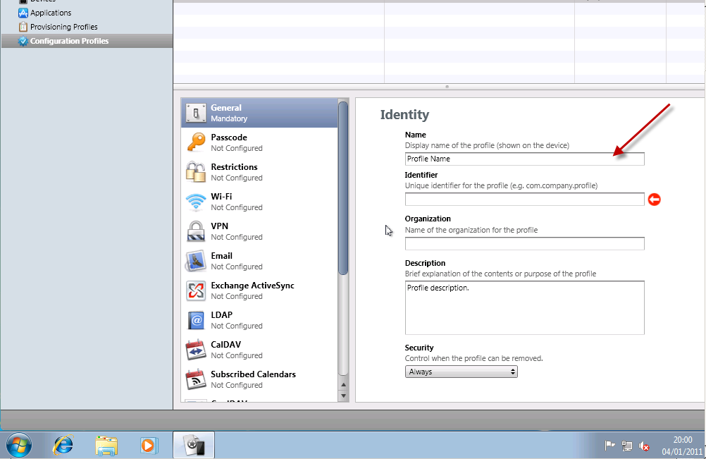 Security – Here we can control when the profile can be removed, i like to be a little cautious when working with mobile devices so i leave this so the profile can be always removed.
