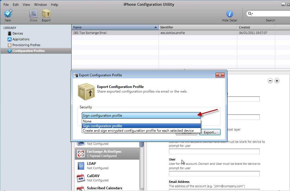 In the Export Configuration Profile wizard that opens, you have the chance to sign your profile, sign and encrypt a profile for each device, or to choose None.