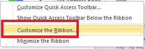 Right click the Ribbon and click on ‘Customize the Ribbon’