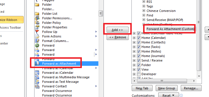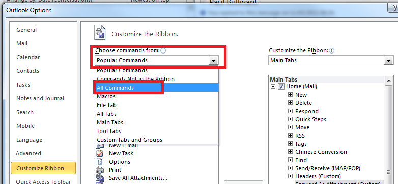 On the right hand side, use the drop down arrow to choose the commands you want to select. Choose – All Commands and scroll to ‘Forward as an Attachment’