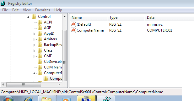 Now browse to HKLM>Old>CurrentControlSet1>Control>Computername>Computername