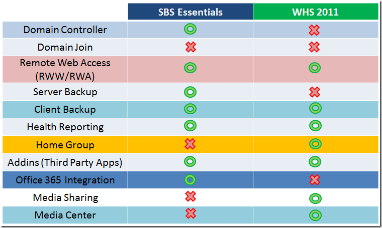 A question came up on my twitter feed search about the differences between SBS Essentials and Windows Home Server. I tweeted back a simple reply, but got to thinking that perhaps those differences are not being explained or that the info is just not out there or easy to find. So i drew up this quick overview table showing the key differences between the two systems, and go into a bit more detail below.