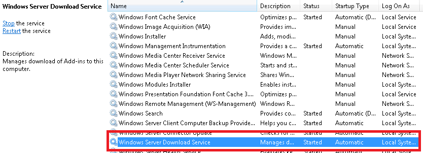 However on a Connected client if you open up the Services console you will see a service called Windows Server Download Service, whose job, according to the description is to manage downloading Add-ins from the server.