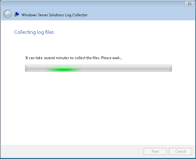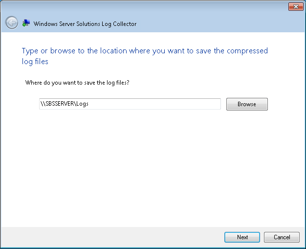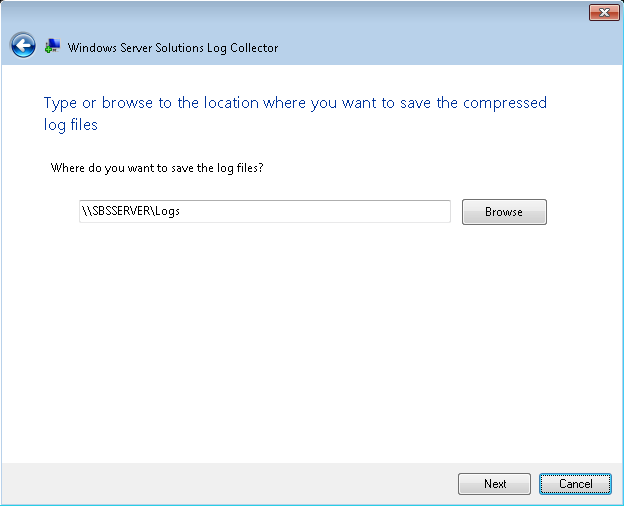 Running the tool will present a screen asking you where to save the collected log files, the default when running on a server will be \\SERVER\Logs the logs are stored in the familiar c:\ProgramData\Microsoft\WindowsServer\Logs folder. That folder, on an SBS Essentials server will contain approximately 57 log files.