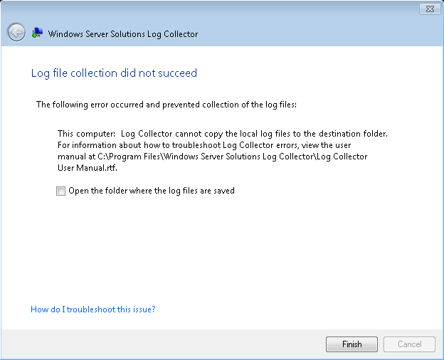 The server logs had been collected, but not those of the client. However the cool thing here is it exposed the User Manual, which i didn’t know existed. You can find that here C:\Program Files\Windows Server Solutions Log Collector\Log Collector User Manual.RTF