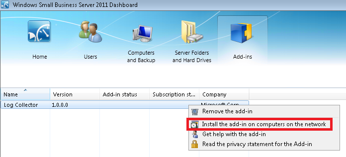 Right click on the Log Collector Add-In to see your options. Click on the ‘Install the add-in on computers on the network’ option.