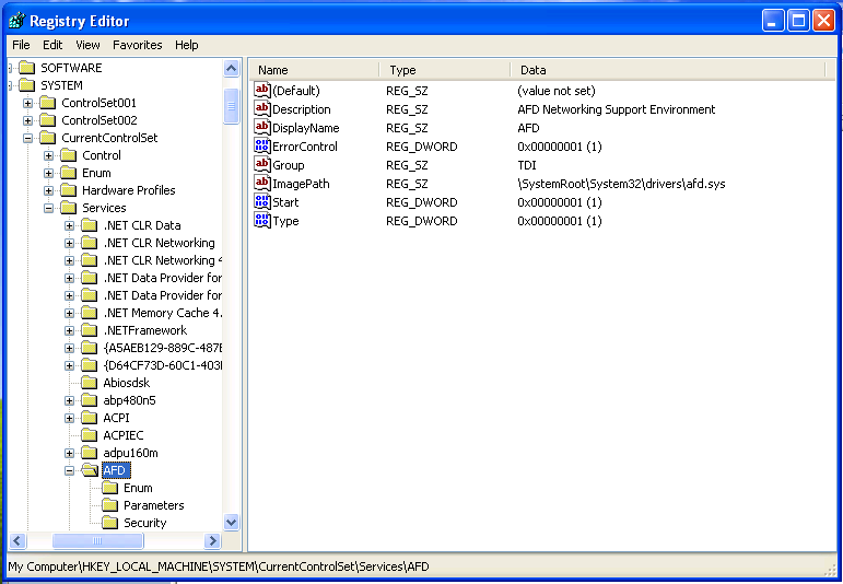 damn i have quite a problem here right now i have just this notebook with vistas on it and a pc with xp which seems doesnt have an afd service nor the file (found it and placed it in sys32 drivers folder) nor registry entry (in whole reg) i need to make it running asap so after i found afd.sys file and copied it in the folder you said i restarted the pc the current state is… that i have the file there so nothing deleted it (yet:-D) but the service is missing and im registry i found it just in HKLM\SYSTEM\Controlset001\Control\Safeboot\Network and there is a “folder” AFD with one entry which is service just that (REG_SZ type) then in HKLM\SYSTEM\Controlset001\enum\Root\LEGACY_AFD000 there seemsdceto be some complete service entry with key classes devicedesc etc. then in controlset002 (same destination and state(1 entry in it)) and also the legacy_afd (same as in controlset001) and the same is for currentcontrolset which means that in safeboot mode it should work… now i need it to get running in normal mode too i desperately need a help