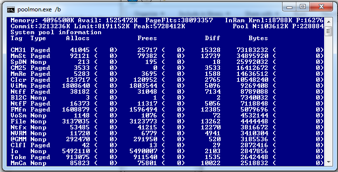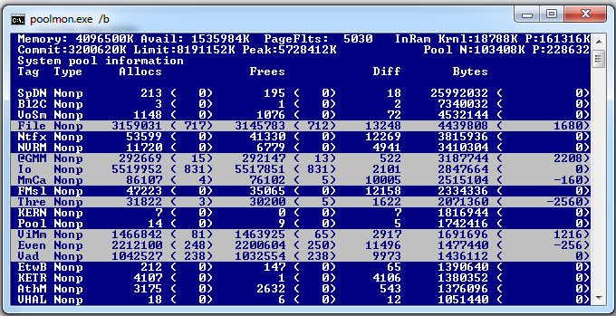 Again, pointing you back to this post we can use Poolmon to search for the difference between Allocations and Frees and hopefully one will jump out as taking up a large amount of memory.