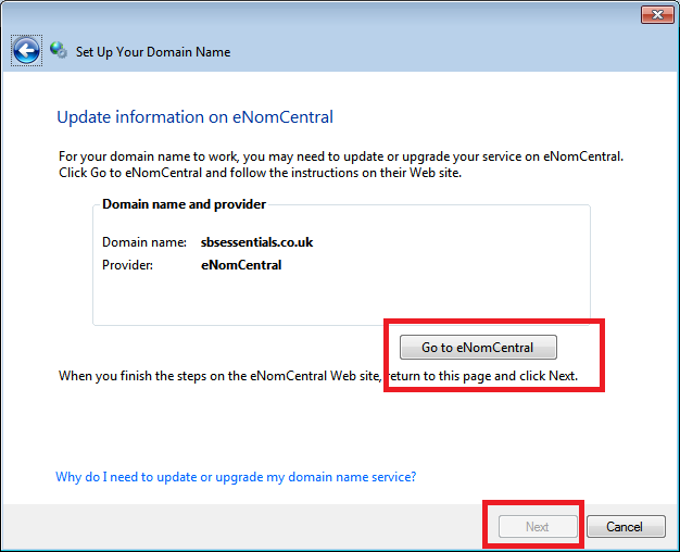 If your domain is with Enom or GoDaddy and you hit this page, don’t worry about actually going to the site it suggests, as it is not required. Just click to the link to go to the page, then close the window. In the wizard, then ‘next’ button is now active and you can continue on.