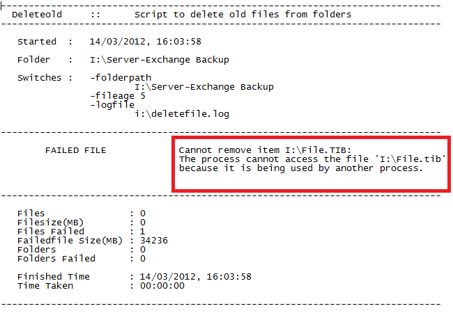 It was working, but failing to delete one file in particular giving me the error that the file was in use.