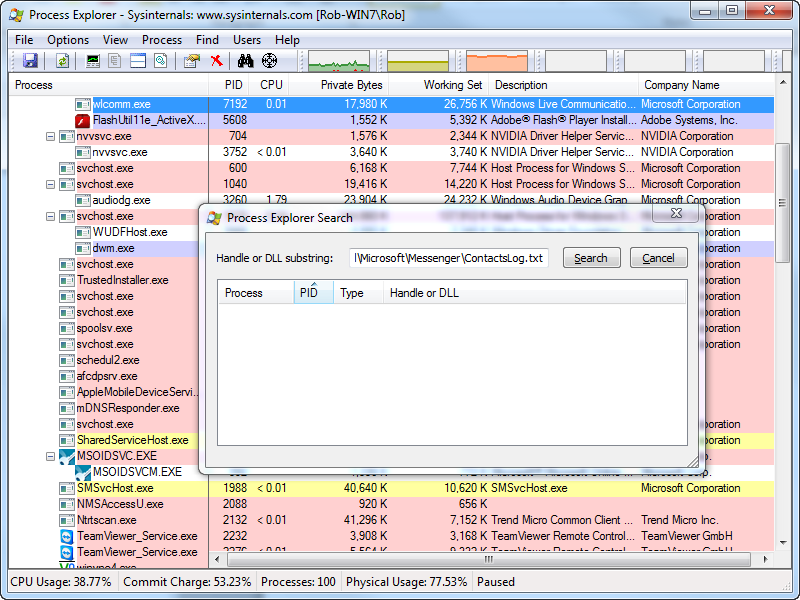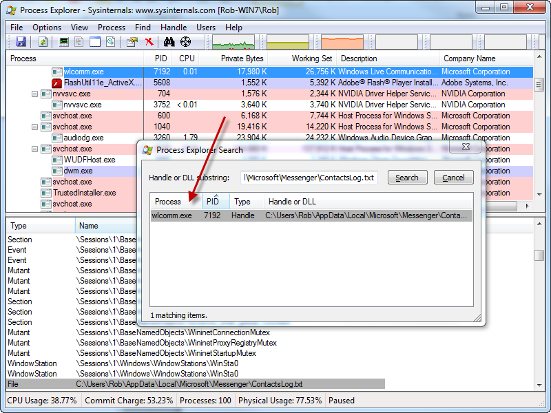 The file is located, and we can see that the wlcomm.exe process has a handle open to the file we searched for.