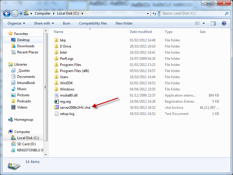 As you can see i have a file called server2008r2.vhd – this is my Server 2008 R2 Installation.