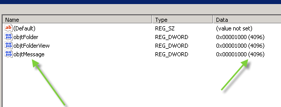 You need to create a new Key named ‘MaxObjsPerMapiSession’ and then create DWORD (32bit) entries for each of the settings in the table above that you wish to change.