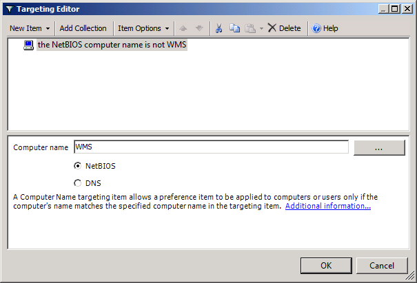 We will want to exclude the WMS server from getting the RDP file when a user is logging in. Click the Common tab and select the “Item-level targeting” check box, then click the button Targeting… button.