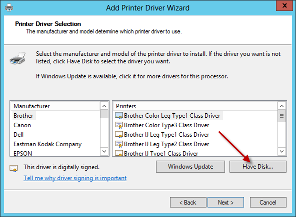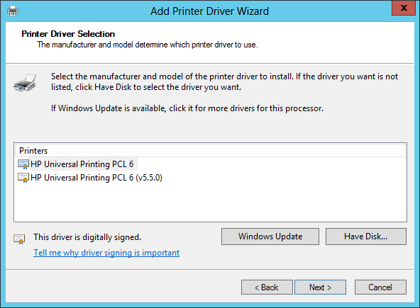 Next you chose the Driver files. I will click on Have Disk, and browse the to the x64 universal print driver folder.