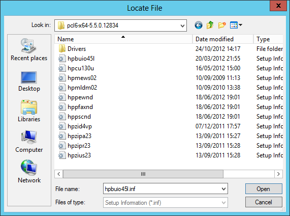 This is where we will add our x86 (32bit) Printer Driver. You will need to download that from your manufacturer. For this printer, and my Windows 7 x86 clients i have downloaded the HP Universal Printer Driver.
