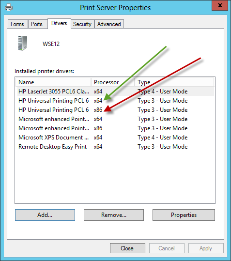 The problem being in order to install a printer on the Server, you need the x64 bit driver, but on a client pc you may be on x86 (32Bit) Windows, so you need a different driver.