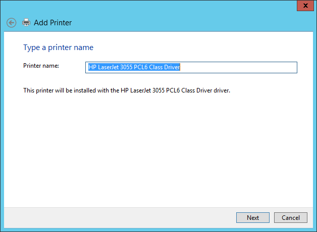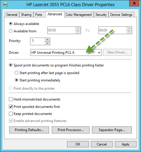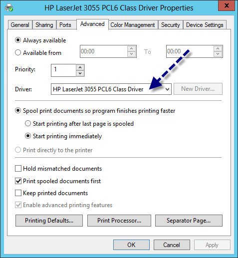 Now, we need to change the driver that Windows uses for the printer we installed. Currently if we shared the printer AS IS, x86 clients would search for a 32bit equivalent driver for the HP Laserjet 3055, which it will not find.