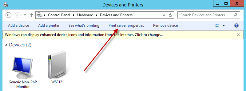 Once that is installed, you will be back to the Devices and Printers window. Select your Printer and choose ‘Print Server Properties’ at the top of the window.