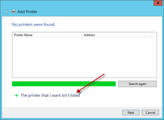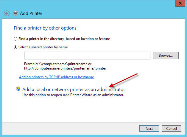 Thanks for the helpful guide. I’m following your instructions logged in as Administrator to 2012 R2 Essentials, but when I get to the step of clicking on “The printer I want isn’t listed” I don’t get the option to “Add a local or network printer as an Administrator” – merely the “Find a printer by other options” in your following step.
