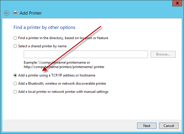 The printer i am adding is connected to the network, so i am choosing to ‘Add a printer using TCP/IP address..’