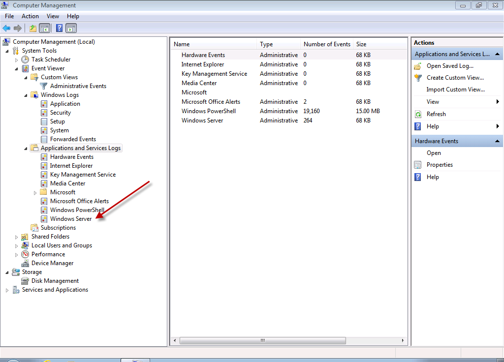 Windows 7 Client check the Event Log > Applications and Services Logs > Windows Server
