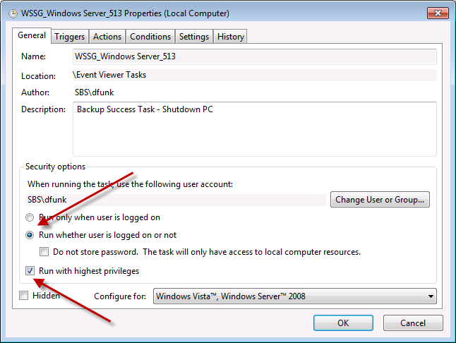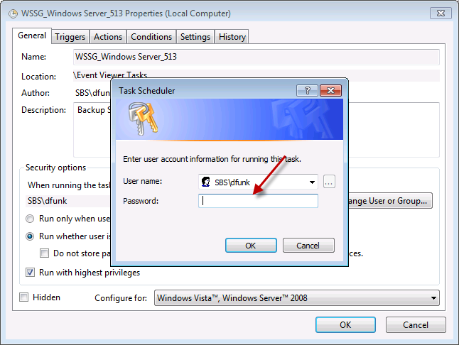 In the properties we can set to run this task if the user is logged on or not, and to run in an elevated manner. Clicking OK will prompt for a password to save the task, and that is all you need to do.