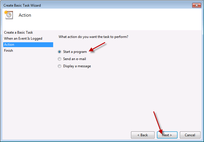 On the Action page, you can chose whether this will be a program, email or a message – you can always add more actions later.