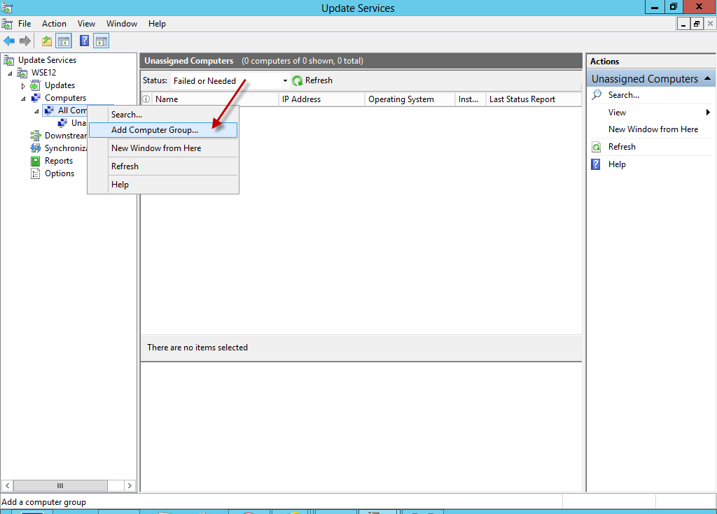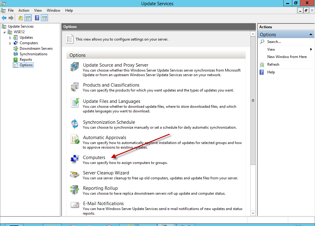 Inside the WSUS Console go to Options, expand Computers, and right click on ‘All Computers’ Click Add Computer Group and type a name for the group. I am adding two groups, one for Client PC and one for the Essentials Server.