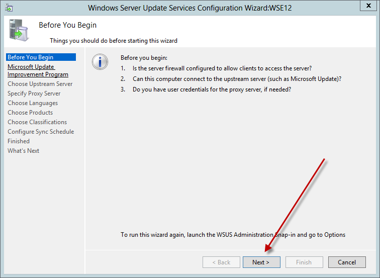 Next a wizard will start when to configure the more detailed WSUS Settings.