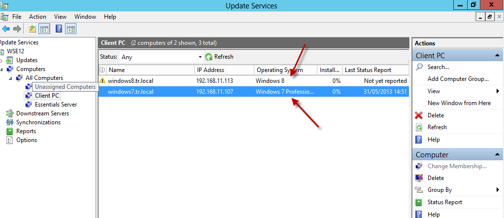 5. Wait a few minutes and check your WSUS for Computers in either Unassigned Computers or All Computers. In the top of the panes for each of the categories insure uou have it to where it’s “ANY” as far as types.