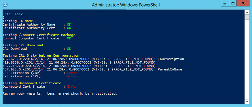 When you check the CA, it will check that the CA is available, that it has the right name (that is important), that the certificate set in the Registry for the Dashboard matches what you have in your Local Machine Store, it will even download a copy of the CRL from your server and test that it is publishing the right information.
