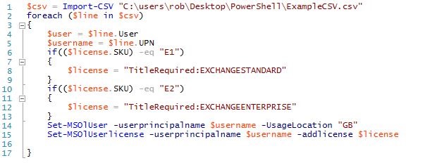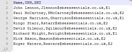 As you can see from my above CSV, i have several fields, User, UPN, and SKU. Self explanatory.