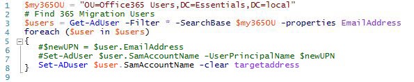 When you work with Users in Office365 PowerShell, you will always need to refer to the UserPrincipalName (UPN). So we took the step to make all internal UPNs match the users email address.