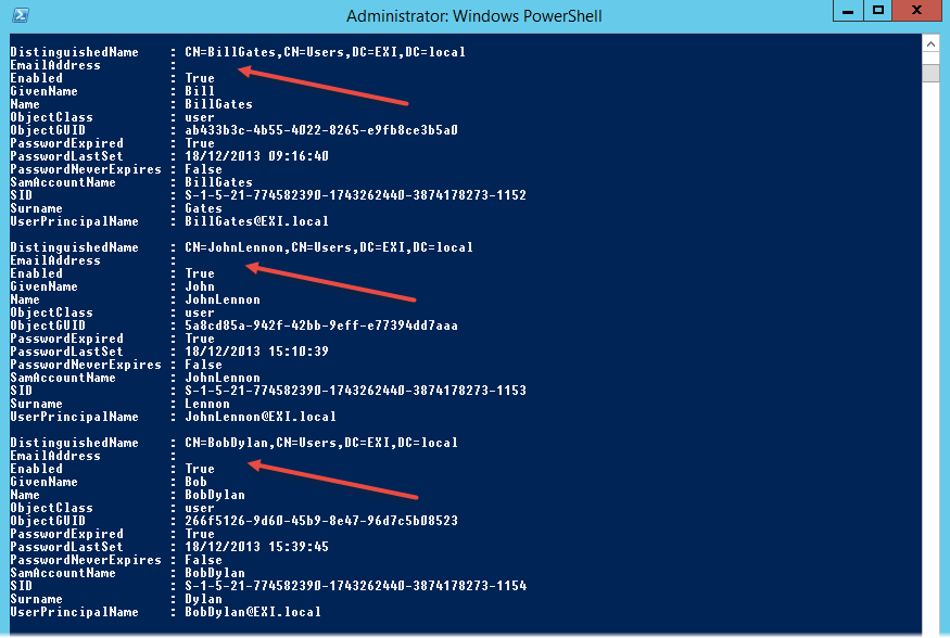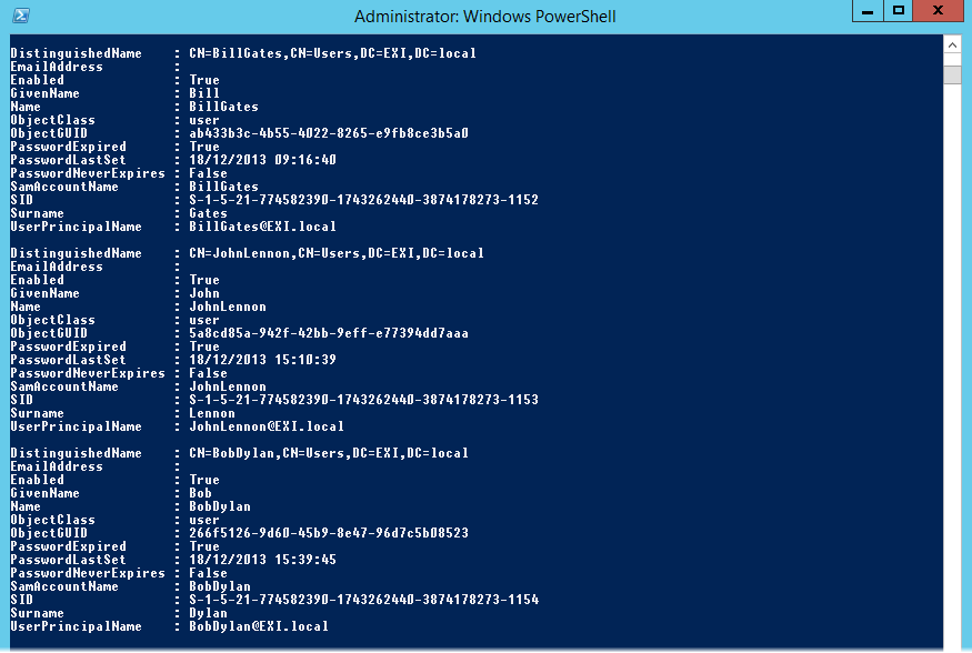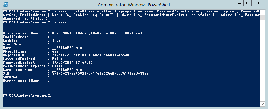 We can simply put that command into any PowerShell window on our server, and see which users it finds. The command as shown here, will find ALL USERS in the Domain, and then process each one to only store those that the Account is enabled, the Password does expire and where the Password is not currently expired.