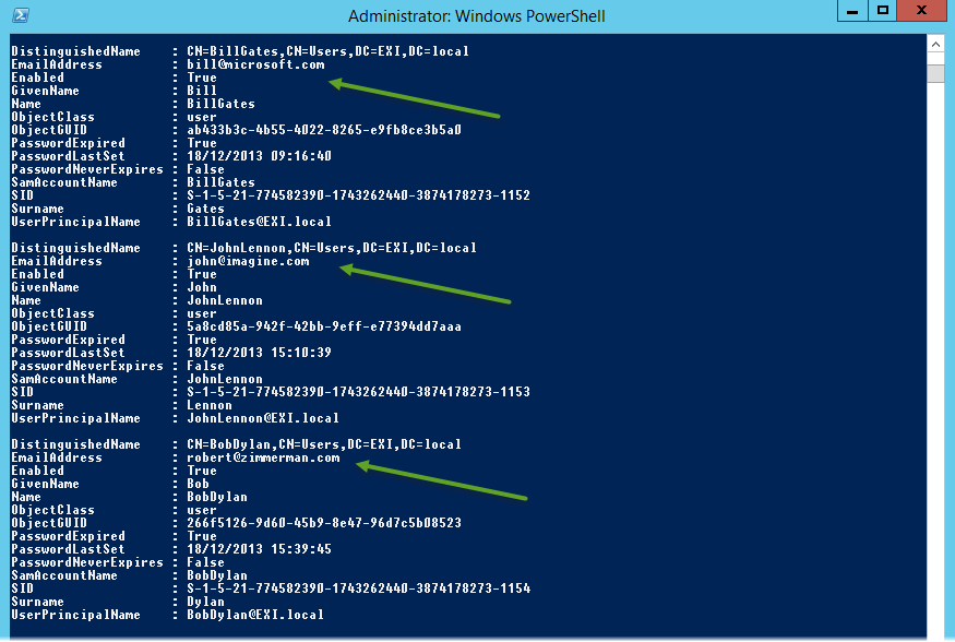 You can see above that none of these users have an email address stored in Active Directory. That is relatively easy to solve by simply editing the user account properties.