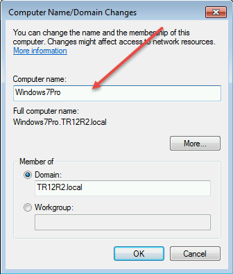 I will start with the Windows 7 machine, hopefully you know how to reach system properties and the computer rename area.
