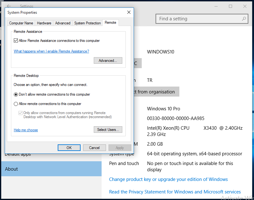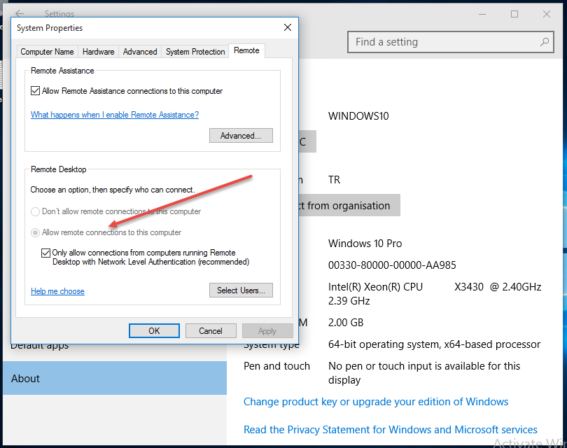 Switching to the Windows 10 machine, i can see RDP Connections are indeed disabled.
