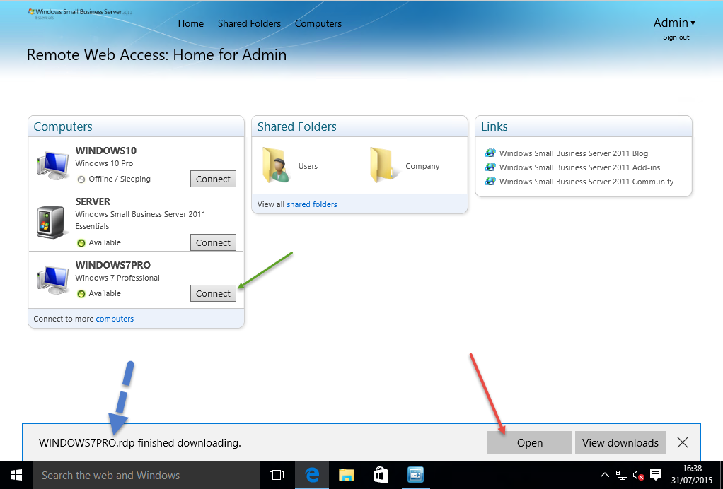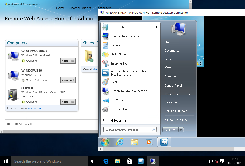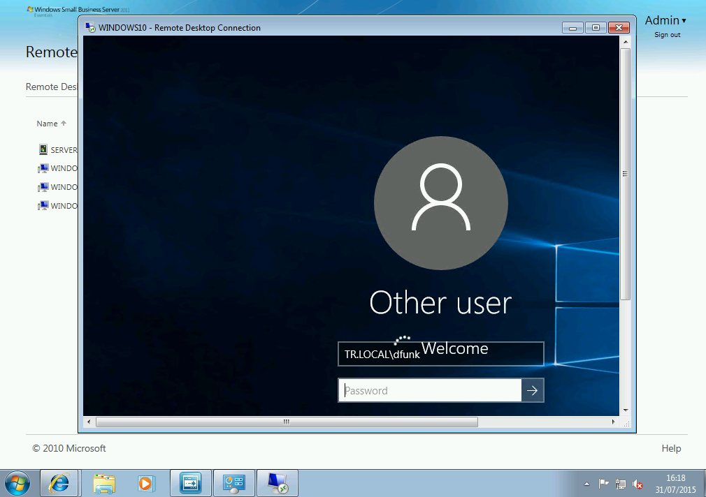 Next i want to look at Remote Web Access. First, Remote Desktop into our Windows 10 machine.