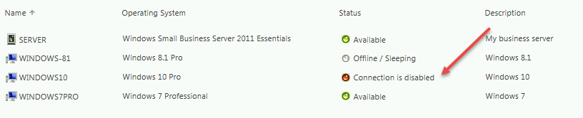 Logging into the RWA page and looking for my Windows 10 machine, i can see it lists its RDP connection as disabled.